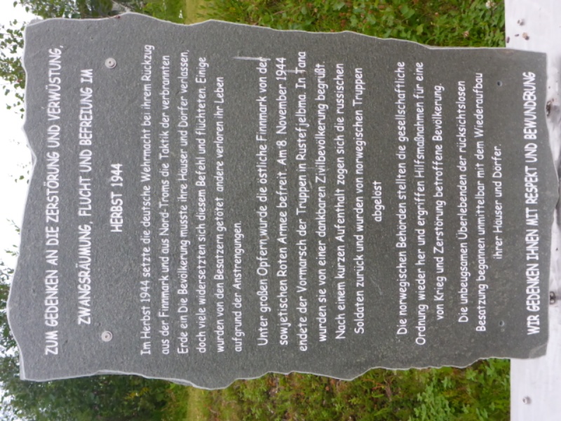 Von Tana bru fahren wir nach Rustefjelbma weiter. Wir bekamen den Hinweis der Bedeutung dieses Ortes von unserem Wirt in Varangerbotn. Es sei der letzte Ort der deutschen Besatzer in Norwegen bevor diese sich im November 1944. zurückzogen. Bei ihrer kämpferischen Gegenwehr wurden die Norweger von der russischen Armee unterstützt.