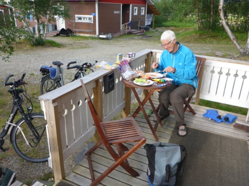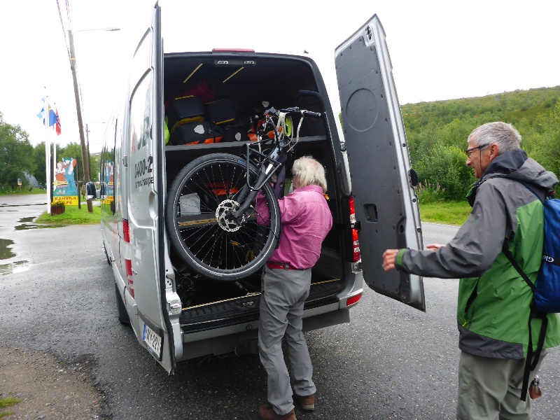 Aufgrund der miesen Wetterlage (angesagter Starkwind mit Boen, Schauer, Frühtemp. bis 8 Grad runter) entscheiden wir uns für den Bus bis Inari. Schade, diese uns bereits bekannte Traumstrecke wären wir gern geradelt. Bitte, haltet Walter nicht für unhöflich, aber der Fahrer lehnte Hilfe deutlich ab. Die 30 kg wollte er alleine stemmen.